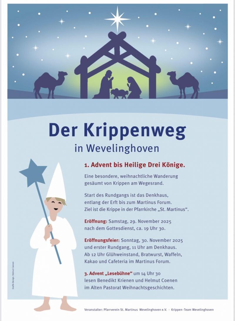 Der Krippenweg in Wevelinghoven findet jedes Jahr von etwa dem 1. Advent bis zum Dreikönigstag statt und ist eine beliebte Veranstaltung mit liebevoll gestalteten Krippen rund um die katholische Kirche St. Martinus und das Pfarrzentrum. Der Wevelinghovener Krippenweg eröffnet am 29. November 2025 mit einem Gottesdienst, die offizielle Eröffnungsfeier ist am 30. November 2025 ab 11:00 Uhr mit einem ersten Rundgang.