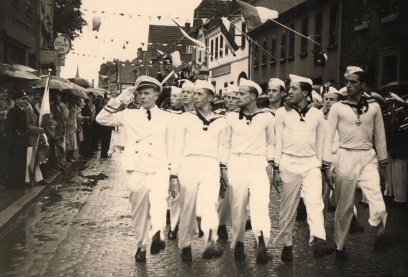 Aber erst einmal gründeten die Jungs, man höre und staune, den Marinezug "Blaue Jungs" und führte oder besser gesagt trug auch schon 1949 eine mit Kerzen beleuchtete Fackel mit durch den Fackelzug. Das Fackel-Motiv war eine Windmühle, welche von vier Schützen getragen wurde und den Titel: „Straße frei he kütt de Mühlestroß“ trug. Den Fackelbau setzte man 1950 fort mit, wie soll es anders sein, einem Passagierschiff als Fackel auf Räder und auch schon elektrisch beleuchtet. Es sollten noch viele Fackeln folgen, wie auch in diesem Jahr. Eine Fahne wurde 1951 angeschafft und die Zugstärke zeigte schnell wie man dem Brauchtum direkt nach dem 2. Weltkrieg zusprach.