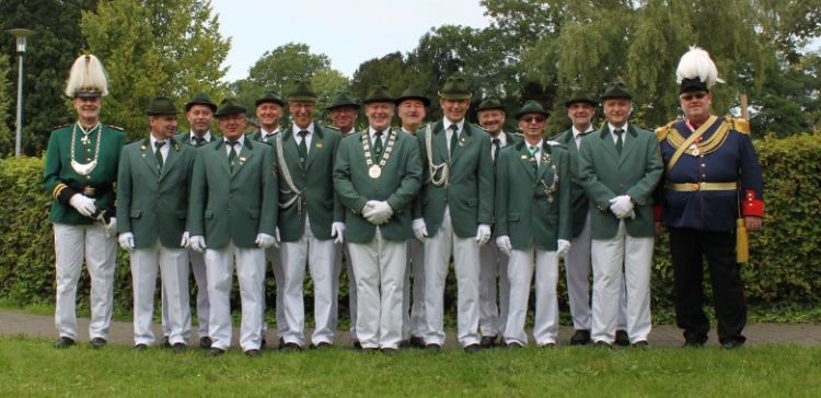 Das Bild aus dem Schützenjahr 2017 zeigt von links: Hartmut Batz (damals Regimentsspieß), Christoph Klasen, Hans-Ferdi Koppen, Christian Dräger, Uwe Lammers, Bernd Bolz (Zugführer), Willibert Funken, Hans-Dieter Schmitz (Zugkönig), Andreas Weiß, Wolfgang Klasen (Leutnant), Jürgen Lammers, Dirk Gehlen, Ulrich Dohlen, Ralf Lammers, Peter Schrörs (aktueller Regimentsoberst).
